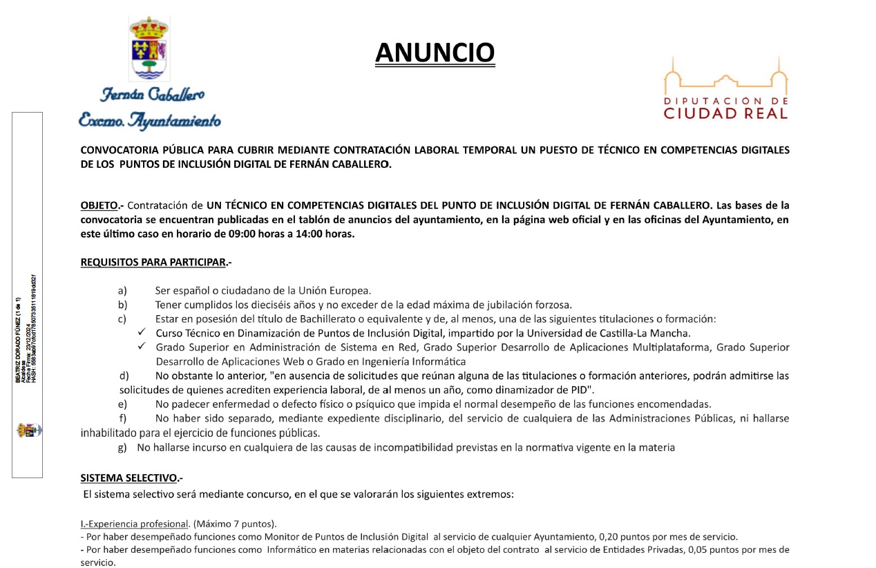 RESOLUCIÓN DE ALCALDÍA APROBANDO LA SELECCIÓN DE UN PUESTO DE TÉCNICO EN COMPETENCIAS DIGITALES DE LOS PUNTOS DE INCLLUSIÓN DIGITAL