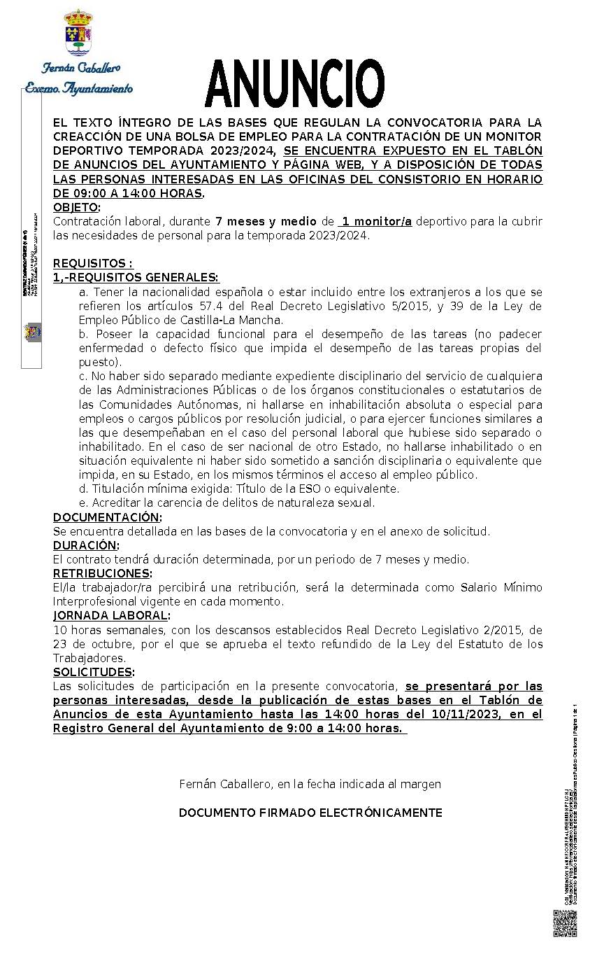 ANUNCIO – CONTRATACIÓN DE 1 MONITOR DEPORTIVO TEMPORADA 2023/2024