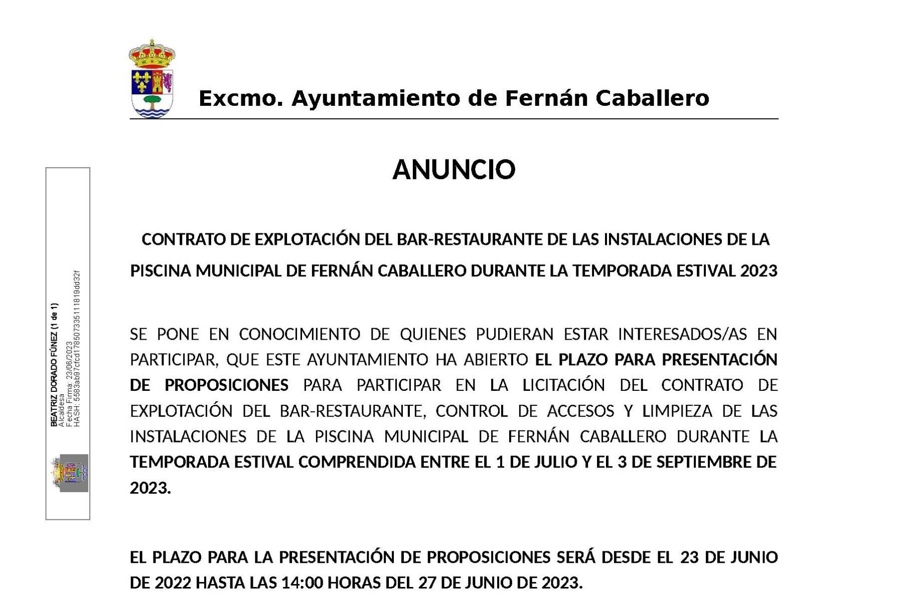 ANUNCIO – CONTRATO DE EXPLOTACIÓN DEL BAR-RESTAURANTE DE LAS INSTALACIONES DE LA PISCINA MUNICIPAL DE FERNÁN CABALLERO DURANTE LA TEMPORADA ESTIVAL 2023