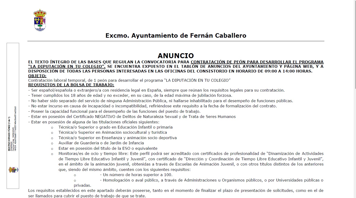 RESOLUCIÓN DE ALCALDÍA APROBANDO LA SELECCIÓN DE 1 PEÓN PARA EL DESARROLLO DEL PROGRAMA “LA DIPUTACIÓN EN TU COLEGIO 2025-2026”