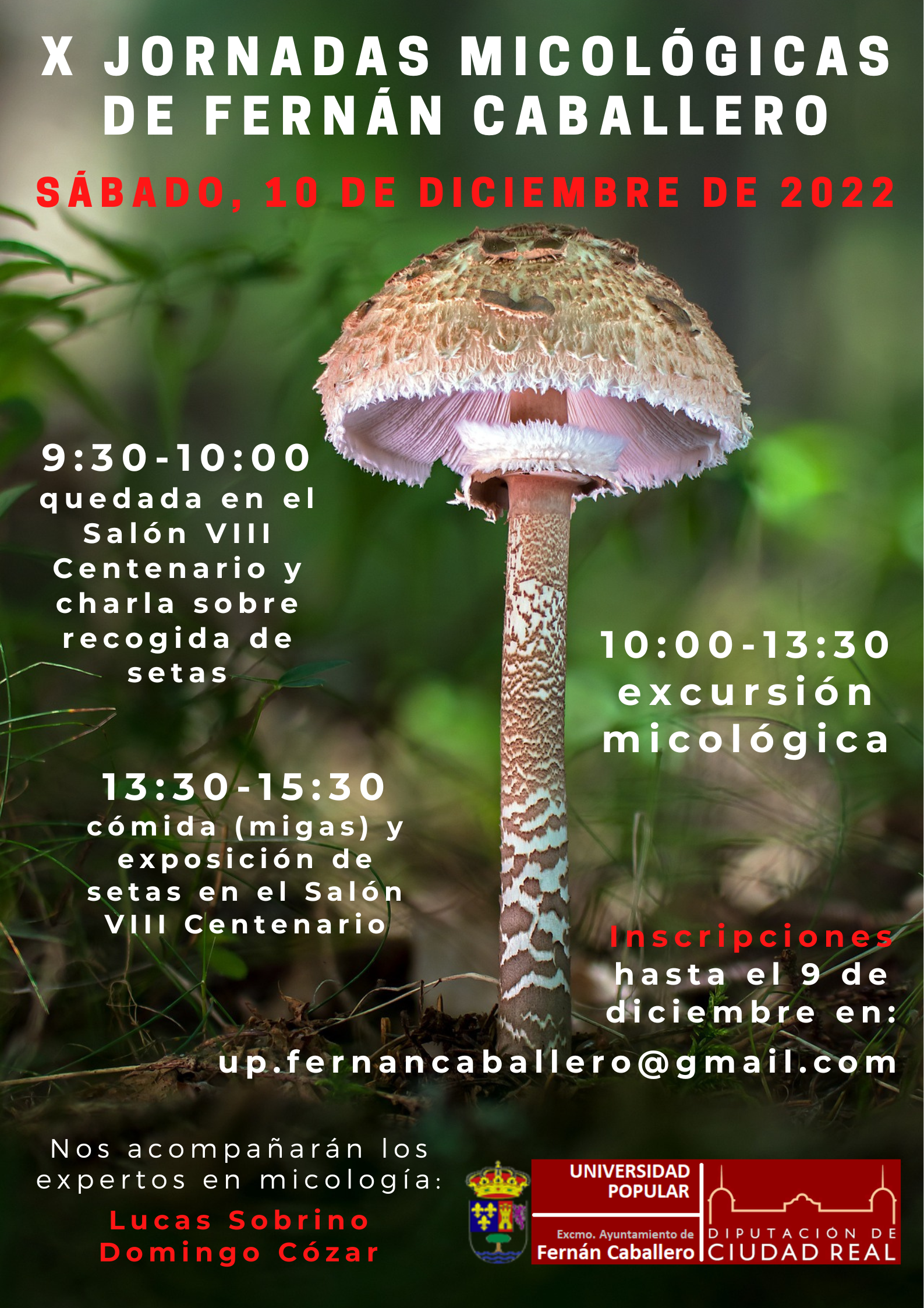 X JORNADAS MICOLÓGICAS DE FERNÁN CABALLERO. Sábado, 10 de diciembre 2022. De 9:30 - 10:00 Quedada en el Salón VIII…