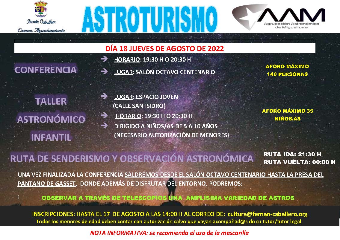 DÍA 18 JUEVES DE AGOSTO DE 2022. CONFERENCIA: Horario: 19:30 horas y 20:30 horas.Lugar: Salón Octavo Centenario. TALLER ASTRONÓMICO INFANTIL:…