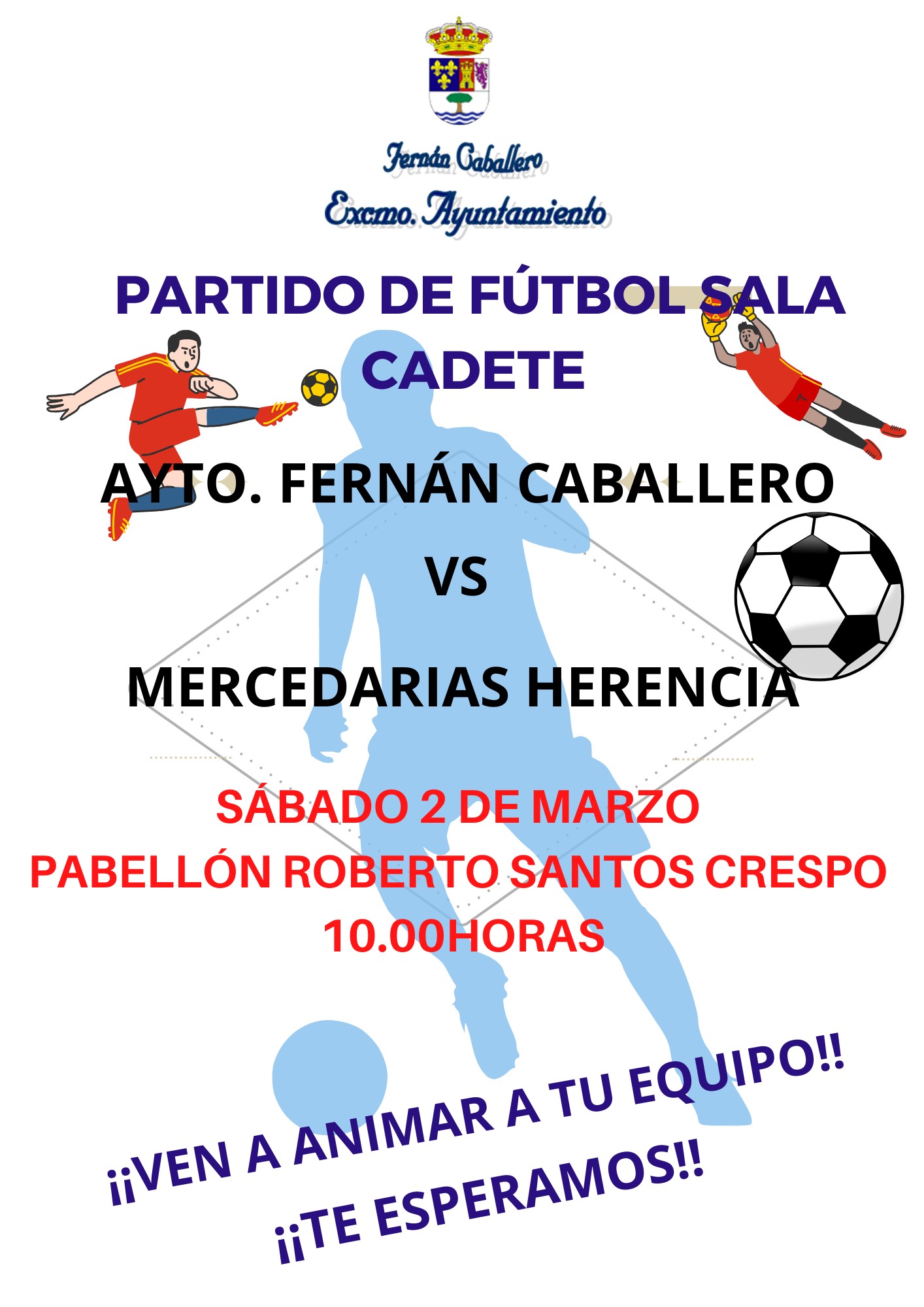 PARTIDO DE FÚTBOL SALA – CADETES 29 de febrero de 2024 Administrador Deportes PARTIDO DE FÚTBOL SALA – CADETES Sábado, 2 de marzo de 2024. A las 10:00. Pabellón Roberto Santos Crespo. Ayto. Fernán Caballero F.S. Mercedarias Herencia. Compartir Twittear Compartir Correo electrónico Administrador Noticias relacionadas FÚTBOL SALA – ALEVÍN MASCULINODeportes GIMNASIO MUNICIPAL – INFORMACIÓN PARA USUARIOSDeportes FÚTBOL SALA – ALEVÍN MASCULINODeportes