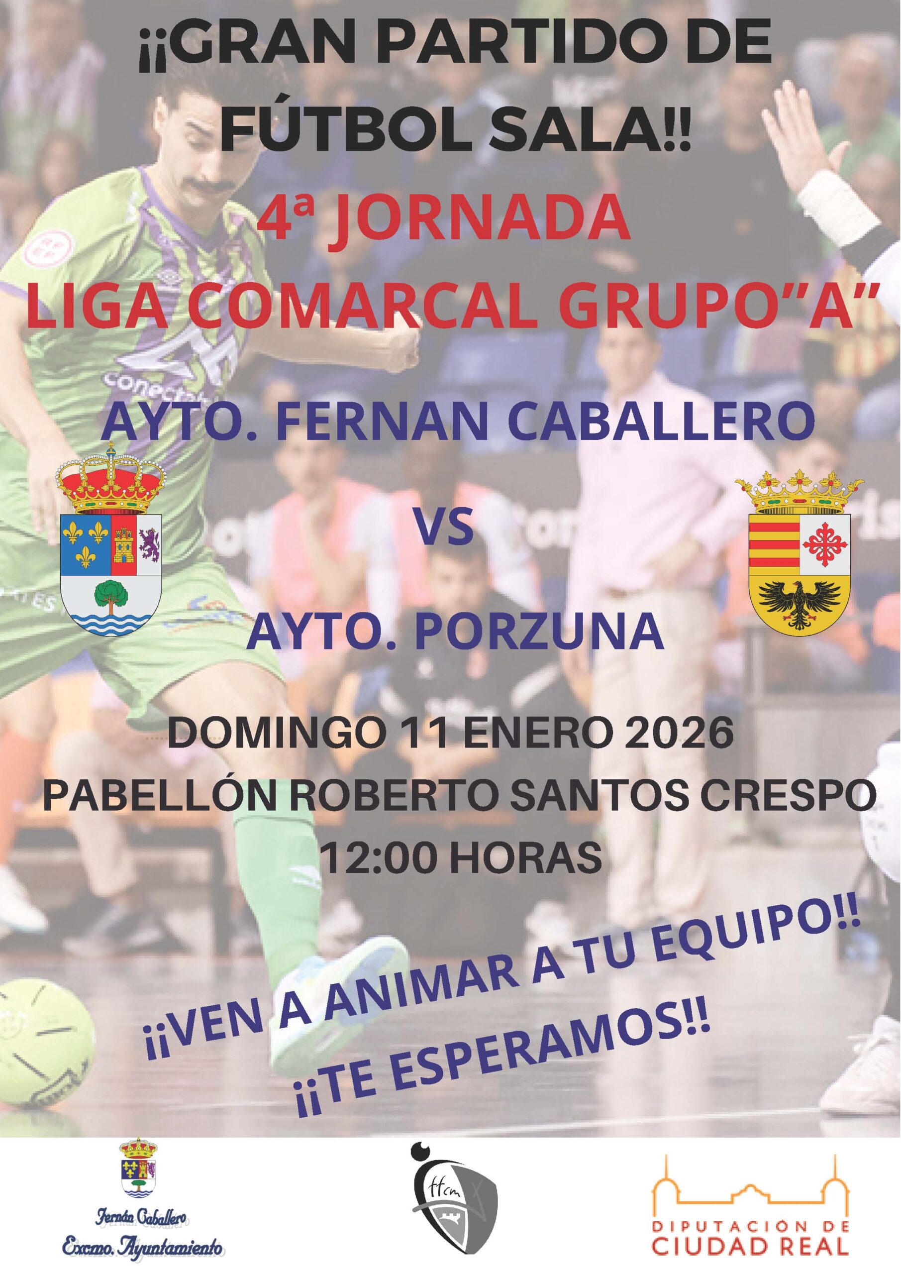 PARTIDO DE FÚTBOL SALA – LIGA COMARCAL 7 de enero de 2026 Administrador Deportes PARTIDO DE FÚTBOL SALA – LIGA COMARCAL – JORNADA 4 – GRUPO A Domingo, 11 de enero de 2026. A las 12:00. Pabellón Roberto Santos Crespo. Ayto. Fernán Caballero VS Ayto. Porzuna Compartir Twittear Compartir Correo electrónico Administrador Noticias relacionadas FÚTBOL SALA -ALEVÍN MASCULINODeportes FÚTBOL SALA – ALEVÍN MASCULINODeportes PARTIDO DE FÚTBOL SALA – LIGA COMARCAL – JORNADA 6 – GRUPO ADeportes