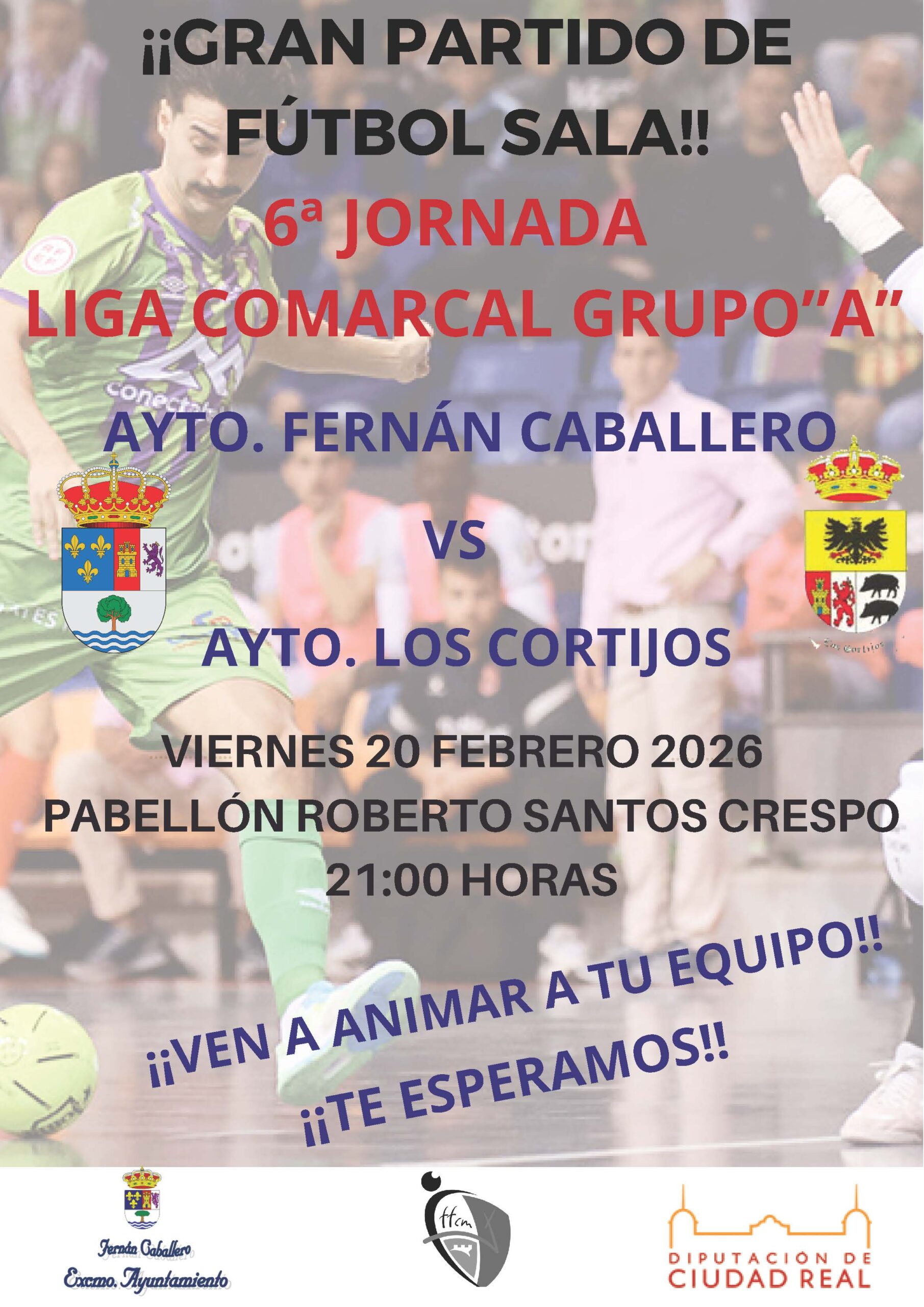 PARTIDO DE FÚTBOL SALA – LIGA COMARCAL – JORNADA 6 – GRUPO A 18 de febrero de 2026 Administrador Deportes Viernes, 20 de febrero de 2026. A las 21:00. Pabellón Roberto Santos Crespo. Ayto. Fernán Caballero VS Ayto. Los Cortijos Compartir Twittear Compartir Correo electrónico Administrador Noticias relacionadas FÚTBOL SALA -ALEVÍN MASCULINODeportes FÚTBOL SALA – ALEVÍN MASCULINODeportes FÚTBOL SALA – ALEVÍN MASCULINODeportes
