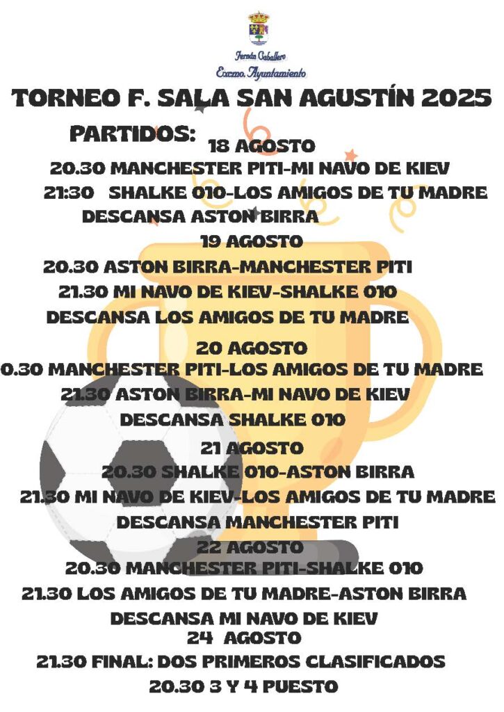 TORNEO FÚTBOL SALA SAN AGUSTÍN 2025 – PARTIDOS 16 de agosto de 2025 Administrador Deportes, Fiestas DETALLE DE TODOS LOS PARTIDOS DEL TORNEO DE FÚTBOL SALA SAN AGUSTÍN 2025. Compartir Twittear Compartir Correo electrónico Administrador Noticias relacionadas FÚTBOL SALA – ALEVÍN MASCULINODeportes GIMNASIO MUNICIPAL – INFORMACIÓN PARA USUARIOSDeportes FÚTBOL SALA – ALEVÍN MASCULINODeportes